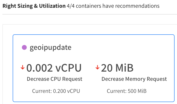 Right Sizing recommendations are provided per container and summarized for the entire workload for easy presentation at a high level. Recommendations per container enable you to easily understand exactly which applications require changes in resource requests and implement those changes quickly.